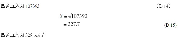 随着采样的进行记录下作为时间函数的粒子计数,并将各次观察到计数的时间与表达式中两列时间相比较。如果与表左侧的一列相比,证明给定的累积观察到计数的出现早于期望时间,该点的采样停止,空气被认为与规定等级限值不相符。如果与表右侧的一列相比,证明累积观察到计数的出现迟于期望时间,该点的采样停止,空气被认为与规定等级限值相符。如果累积观察到计数连续出现在两列时间之间,采样继续进行。如果与表左侧的一列相比较21次,计数仍继续进行,并且没有早于期望时间出现的计数,空气则符合全部单次采样的规定限值。