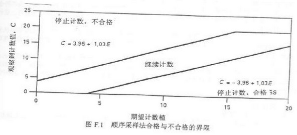 图F.1表示按公式(F.1)和(F.2)建立的界限。截止到E=20为限值,表示收集—全采样量需要的时间,而C=20则为允许的最大观察到计数值。