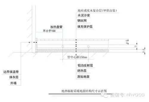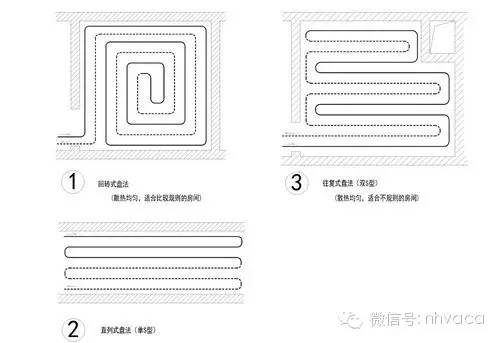 4、供暖管敷设方式和数量由热输出量和管材尺寸决定,供暖管弯曲半径不应小于8倍直径,以20CM为间距进行调整,敷设方式包括联箱排管式、平行排管式、蛇形排管式和蛇形盘管式。