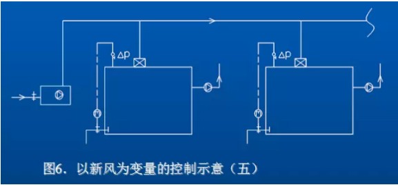 此种系统见图6.一般多适用于一个HVAC系统对多个洁净室的情况,由于风管布置及接管等情况,控制回风较控制新风更易合理实现.
