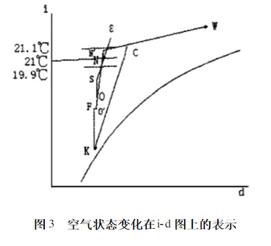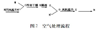 空气处理流程为:新、回风一次混合后进入空调机,先经冷却干燥至机器露点K,再精调至O′,然后与回风二次混合至O点,再由洁净室送风机经高效过滤器以S状态送入室内。