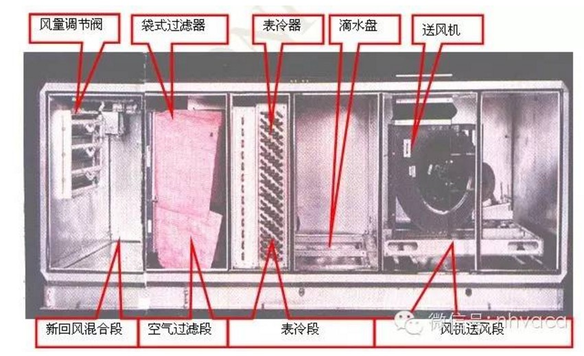 表冷挡水段:设有表冷器和挡水板,采用铜管串铝箔的结构,供空气冷却、干燥用。冬季通热水也可以作加热器用。另外表冷分一次表冷和二次表冷,一次表冷主要起除湿作用,二次表冷一般在蒸汽加热难以控制的情况下起冷却作用。