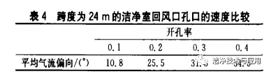 对于既有的跨度较大的洁净室,若对地板格栅进行改造,可以根据具体情况提高局部孔板回风口的开孔率以节省人力和资金。此外,由于跨度为24m的洁净室地板回风口采用满布情况会耗费资金,故从节省投资的角度看,可以采用分散布置孔板回风口,适当提高格栅开孔率的方法来减小气流偏向角,以达到同样好的洁净效果。如果条件允许,也可以在房间中部增加一条回风通道,变相的缩短房间跨度,进而使地板格栅的开孔率增大,从长远考虑,可以在保证较好洁净度的基础上节省能耗。