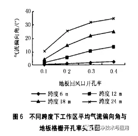 5、不同跨度下工作区平均气流偏向角与地板格栅开孔率的关系
