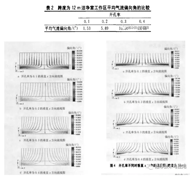 由图2可以看出,跨度为6m的洁净室在4种工况下的流线相差不大,地板格栅回风口以上的区域气流偏向角普遍较小,由表1也可以看出工作区的平均气流偏向角都小于14度,即4种工况都满足国内标准和IEST标准,综合考虑经济问题,笔者认为两种标准跨度为6m的洁净室开孔率推荐值都为0.4.