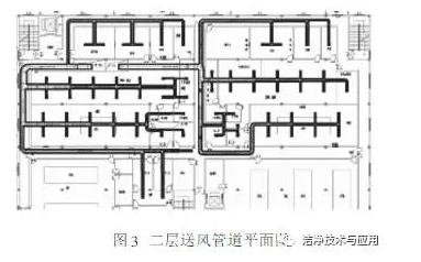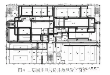 靠墙设置回风柱与排风柱进行回排风。回风同送风系统的划分一样,分为3个系统,回风系统2、3的回风干管通过机房上方的风井把回风送入机组。排风共7个系统,分别设置7个排风机对附近房间进行排风。另外,只对2层洁净走廊设置一个防排烟系统。如图4为2层回排风与防排烟风管平面图。