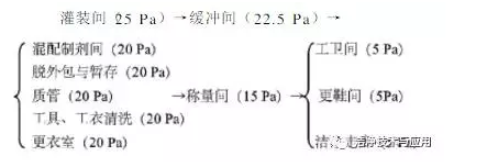 根据各洁净室功能用途和污染物数量种类等因素设计房间压差阶梯顺序,按生产或灌装用房且污染物较少的房间到污染物较多的走廊、更鞋室的顺序,房间压差由高至低。根据工程设计经验设计本工程房间压力和各房间之间的压差,使房间压力按照用途呈一个压力梯度: