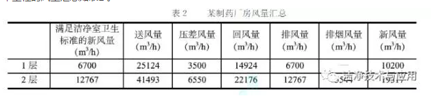 在实际洁净空调工程设计中的送风量计算一般均采用经验换气次数进行计算,表1中列举了GB50073-2001《洁净厂房设计规范》和《医药洁净厂房设计规范》所规定的不同级别非单向流洁净室送风量计算所需的经验换气次数。在本工程中,由于厂房内人员密度很小,洁净等级为100000级的1层洁净区域换气次数取15次/h,2层洁净等级为300000级,换气次数取13次/h,经计算1层总送风量为25124 m3/h,2层为41493 m3/h。