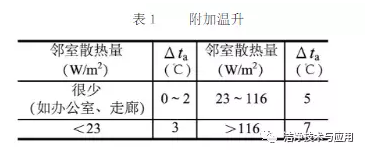 (1)式中:Ki为内围护结构(如内墙、楼板等)的传热系数,W/(m2?℃);Ai为内围护结构的面积,m2;to.m为夏季空调室外计算日平均温度,℃; 为附加温升,可按表1选取。