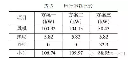 本案例中提出的三种方案计算条件下,不考虑风机再热等,系统需要的计算制冷量相同,实际运行过程中负荷变化等导致的再热量、冬季加湿加热量等在方案比较时很难量化比较,故运行费用主要考虑不同方案中送风机、FFU的运行能耗,并以电功率(kW)为比较参数,见表5。