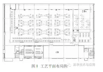 苏州一美资柔性电路板EPC总承包项目中的一个典型工艺房间,房间及工艺布局见图1,总面积1060 m2,净化间净高3.0 m,建筑层高7.0 m,洁净等级为1000级(@ 0.5 μm),温湿度要求:(21±2)℃,(55±10)%。工艺设备较多,有大量热排风,无工艺冷却水。