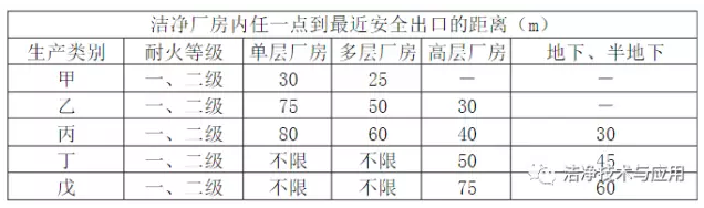安全出口应当分散布置,从生产地点至安全出口不应经过曲折的人员净化路线,并应设有明显的疏散标志,洁净区与非洁净区、洁净区与室外相通的安全疏散门应向疏散方向开启,并加闭门器,安全疏散门不应采用吊门、转门、侧拉门、卷帘门以及电控自动门。安全疏散距离应符合下表规定。