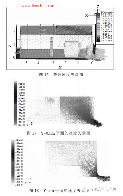 根据以上的数学模型和物理边界条件, 模拟了该接毒无菌室的流场和温度场以及压力场。图16 为整个接毒无菌室内的速度矢量场, 坐标如图。图17 、图18 分别为Y=0.5m 和Y=5m 平面的速度矢量图, 可以看到百级区域的速度矢量达到了垂直单向流的要求, 百级区域的气流几乎全部由百级回风墙回流处理; 而抵达设备上表面的气流则全部由回风墙回流, 也不会通过万级出风口污染更多区域。