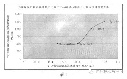 ( 2) 我们可以把上面四组数据用图表1 表达, 可见,要满足局部百级洁净区与万级洁净区间的气流不互相干扰,其无干扰的最小距离值将随着万级送风口风速的增大(送风口面积减少) 而逐渐增大, 即如果增大送风速度, 为了能满足不对百级洁净区产生干扰, 万级区域送风口离百级洁净区边缘的距离也必须增大。