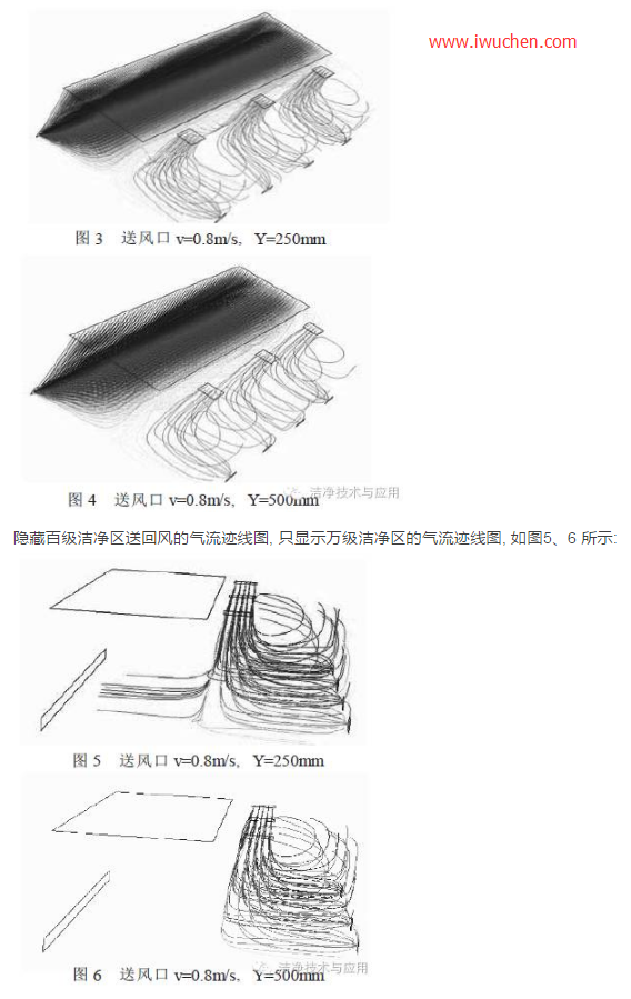 ( 1) 以采用风速为0.8m/s 的万级洁净区送风口送风为例, 当Y 值为500mm 时, 干扰百级洁净区的气流因素可以认为无影响, 万级区域气流不会掺混进百级洁净区的气流中。并且随着Y 值的增大, 都能满足局部百级洁净室的要求。而且百级洁净区送风口送出的气流在万级洁净区的工作区域内不会产生涡流区。如图3、4 所示, 前后比较可见。