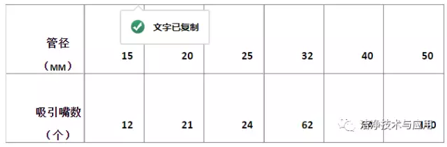 注:表中已考虑了同时使用系数,设计时可根据吸引嘴数直接由表中查出管径,不必再打折扣。但当机房离使用处太远时,应适当放大管径。