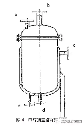 图4是一甲醛消毒罐(Dn=400,h=500,H=1350,Vg=0.08m3)的样图(其中,a为甲醛进口,b为甲醛出口,c为蒸汽进口,d为放水口,e为凝水出口)。