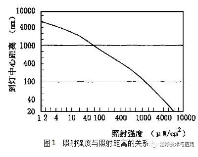 (3)照射距离。在距灯管中心500mm以内,照射强度与距离成反比,而在500mm以上,照射强度大约与距离平方成反比。图1为1支15W紫外灯管照射强度与距离的关系。