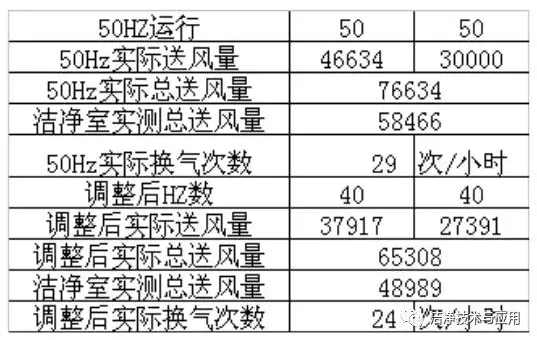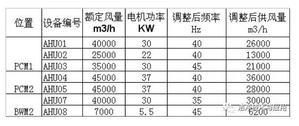 空调机组安装变频器不能自行实现节约电能,空调系统的再调试才是空调系统真正实现节能效果的关键。在保持换次次数不变的前提下,逐次减少变频器频率,同时逐次开大各送风阀的开度,保持机组送风量不变。调整结果如下: