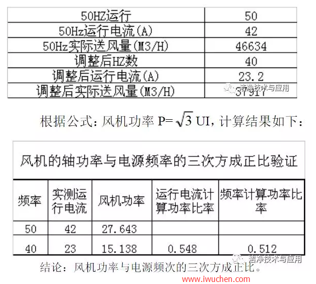理论上风机功率与电源频次的三次方成正比。通过测试风机电机的运行电流进行验证。在空调系统再调试中,对4#空调机组进行了数据测试。数据如下: