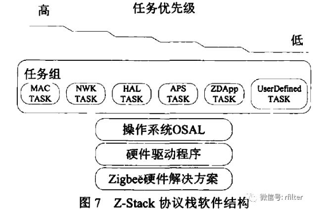 下位机系统软件基于Z-Stack进行开发,Z-Stack是德州仪器公司推出的一种分布式寻址,能够为ZigBee无线网络提供一个完整的解决方案,同时符合ZigBee规范的一种协议栈。Z-Stack协议栈里包含OSAL小型操作系统,官方已经将底层驱动程序编写并调试完毕,用户只需熟悉Z-Stack的应用层,在该层里根据C语言或者ASM语言的语法往里添加自定义功能函数,添加完毕后按照协议栈的任务调度模式,即协议栈的轮询优先控制方式进行自定义任务的管理。Z-Stack协议栈软件结构如图7所示。