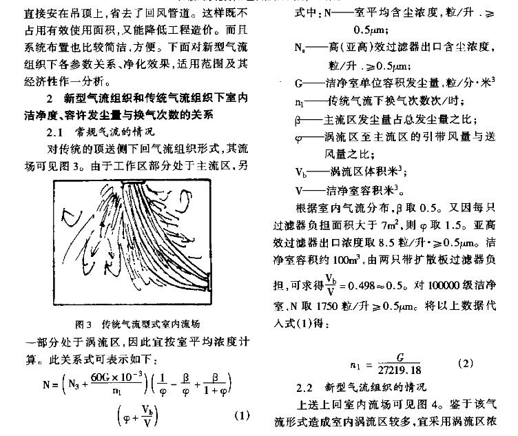 采用上述布置方式, 初效过滤器回风口可直接安在吊顶上, 省去了回风管道这样既不占用有效使用面积, 又能降低工程造价。而且系统布置也比较简洁、方便。下面对新型气流组织下各参数关系、净化效果,适用范围及其经济性作一分析