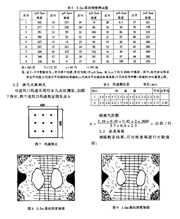 CW取1.0m标高的63个点平均值, 由测定结果知CW =208粒/升?≥0.5μm, 回风口区浓度 取前面2 .2m标高处回风口区浓度1点,5点,42点,45点四点平均值, 代入数据知: CR=270粒/升? ≥0.5μm。