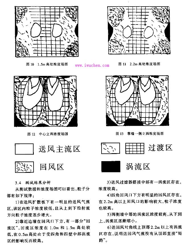 、靠近边墙在回风口下方, 有一部分“ 回流区” , 回流区浓度在1.0m 和1.5m高处较低, 在0.5m高处由于受四角和四壁中部涡流区的影响反而较高。