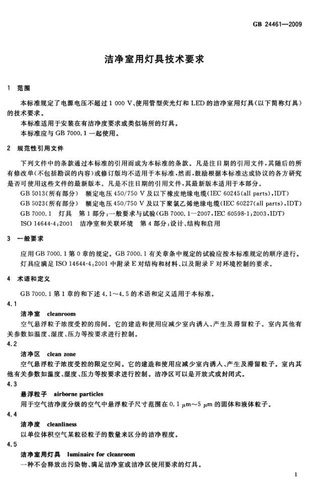 GB24461-2009 洁净室用灯具技术要求(全文版)