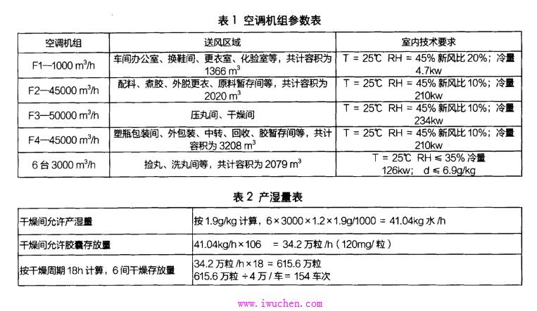(5) 产湿量计算:胶 囊 4640000 粒/18h×120mg/ 粒=30.93kg 水/h;人员 170g×10/1000 = 1.7kg 水/h;
