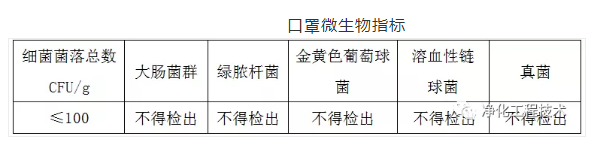 关于微生物指标,灭菌口罩经环氧乙烷灭菌,应无菌,其环氧乙烷的残留量应不超过 10μg/g。对于非灭菌口罩(普通级)应符合下表的要求。