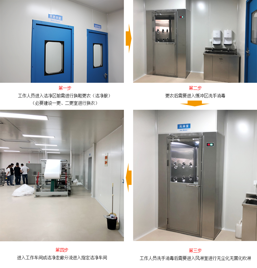 人员方面:从更衣 >> 洗手消毒/缓冲 >> 风淋消毒 >> 洁净走廊 >> 各个洁净车间都必须无尘化。