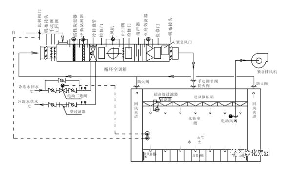 洁净实验室温度控制:洁净实验室的湿度由洁净空气处理机组来保证,根据室内温度来调节表冷器回水管路上电动二通阀的开度。(直接蒸发系统的根据室内温度来调节室外压缩机的起停)。