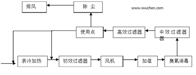 根据厂房的整体设计方案,我公司选用了南京添加空调设备厂生产的分体空调机组。本空气净化系统采用组合式空调箱及风道送风系统,新风经初效过滤器与回风混合再经表冷器、加热器、风机、中效过滤器、臭氧发生器、高效过滤器送至洁净区,气流组织顶送下侧回风或排风。空气洁净度等级为30万级。