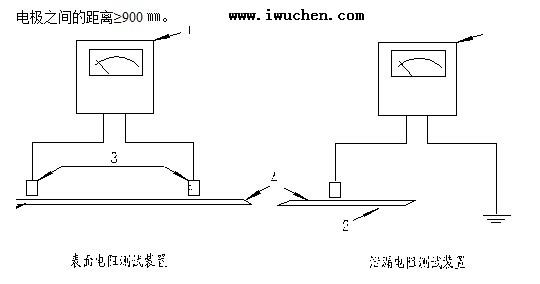 1-高阻计,2-被测表面,3-园柱形铜电极,4-湿渍低。