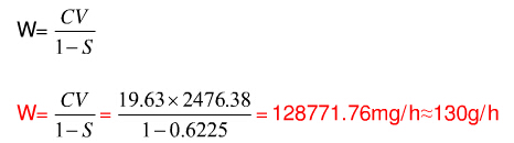 按上述要求,空气中的臭氧浓度(C)应达到10×10-6,折算为19.63mg/m3;臭氧发生器工作1h后,臭氧自然衰退率(S)为62.25%;则选择臭氧发生器的臭氧发生量W(mg/h):