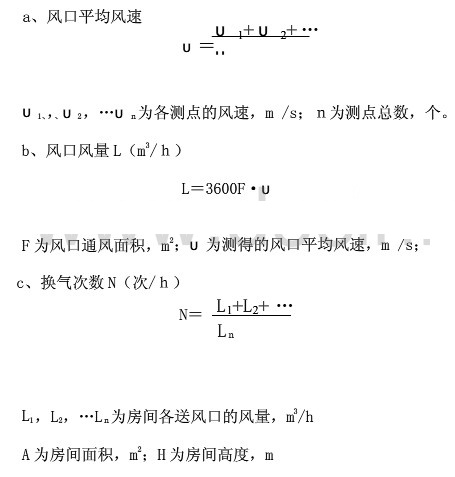 用风速仪贴近风口处测量,按风口截面大小把它划分为若干个面积相等的小块,在其中心处测量。对于尺寸较大的矩形风口,可分为同样大小的9-12个小方格进行测量;对于尺寸较小的矩形风口,一般测5个点即可;对于条缝形风口,在其高度方向至少应有2个测点,沿条缝方向根据其长度可以分别取为4、5、6个测点;对于圆形风口,按其直径大小可分别测4或5个点;