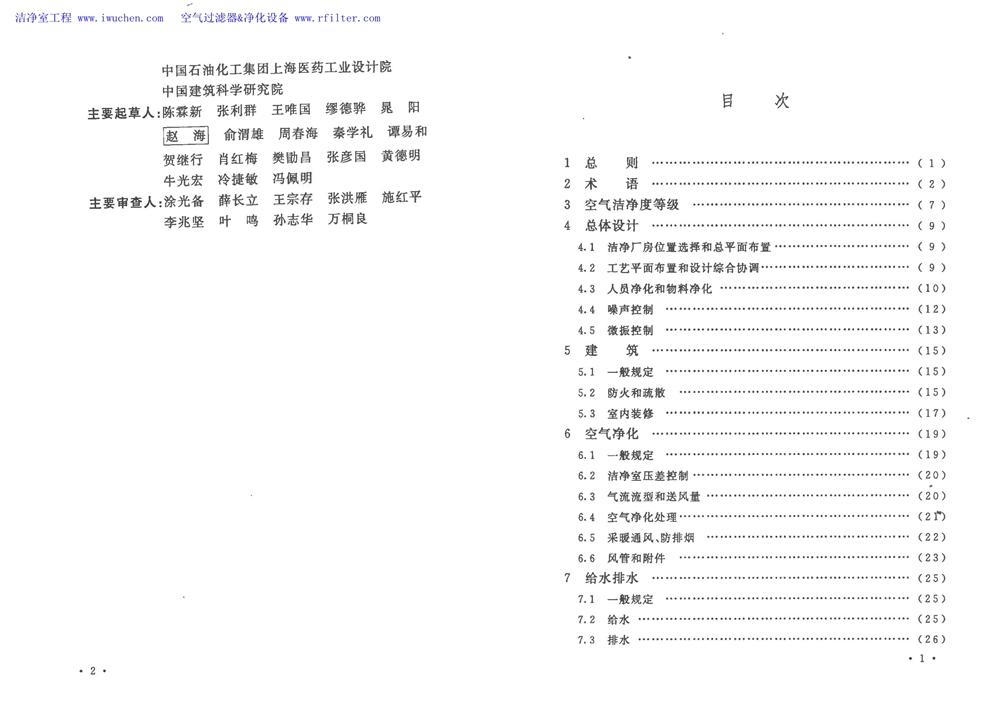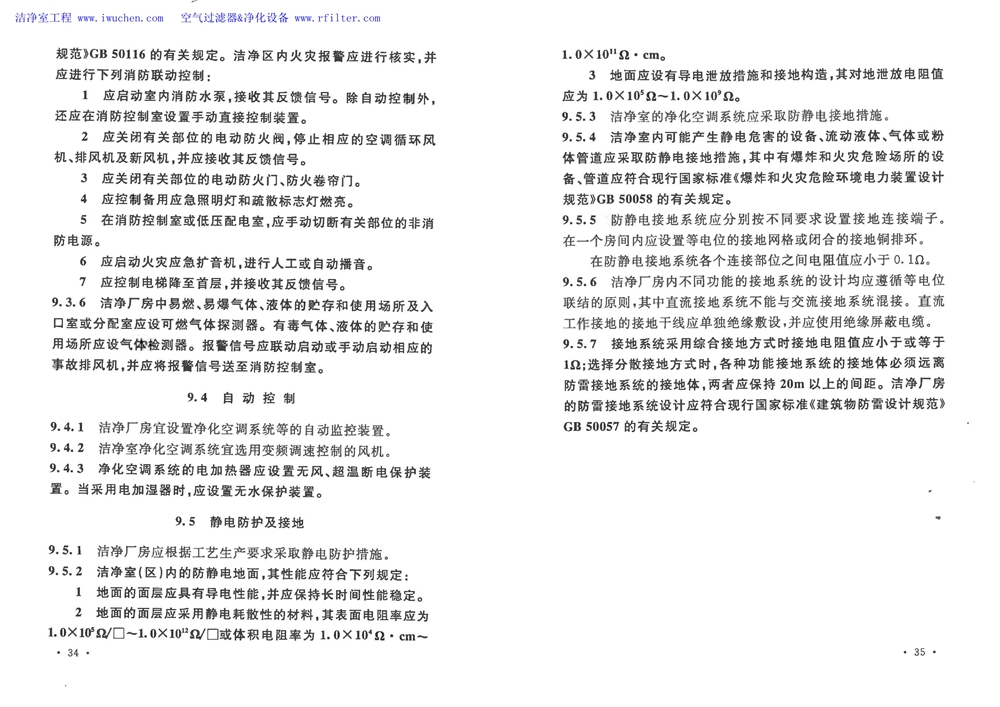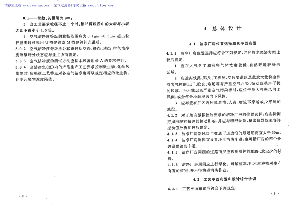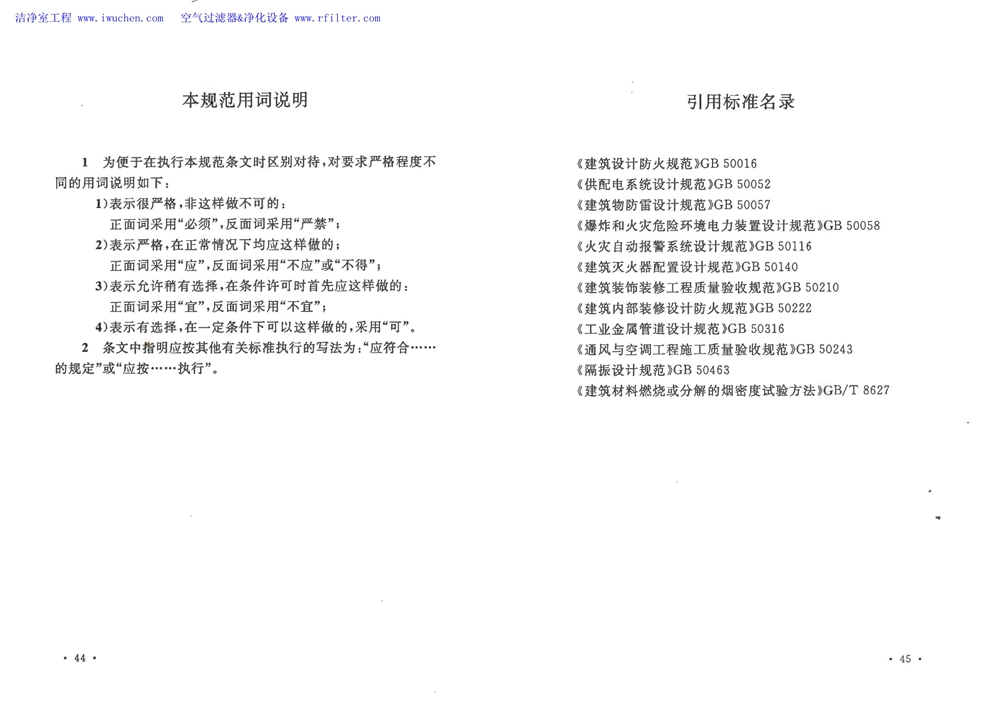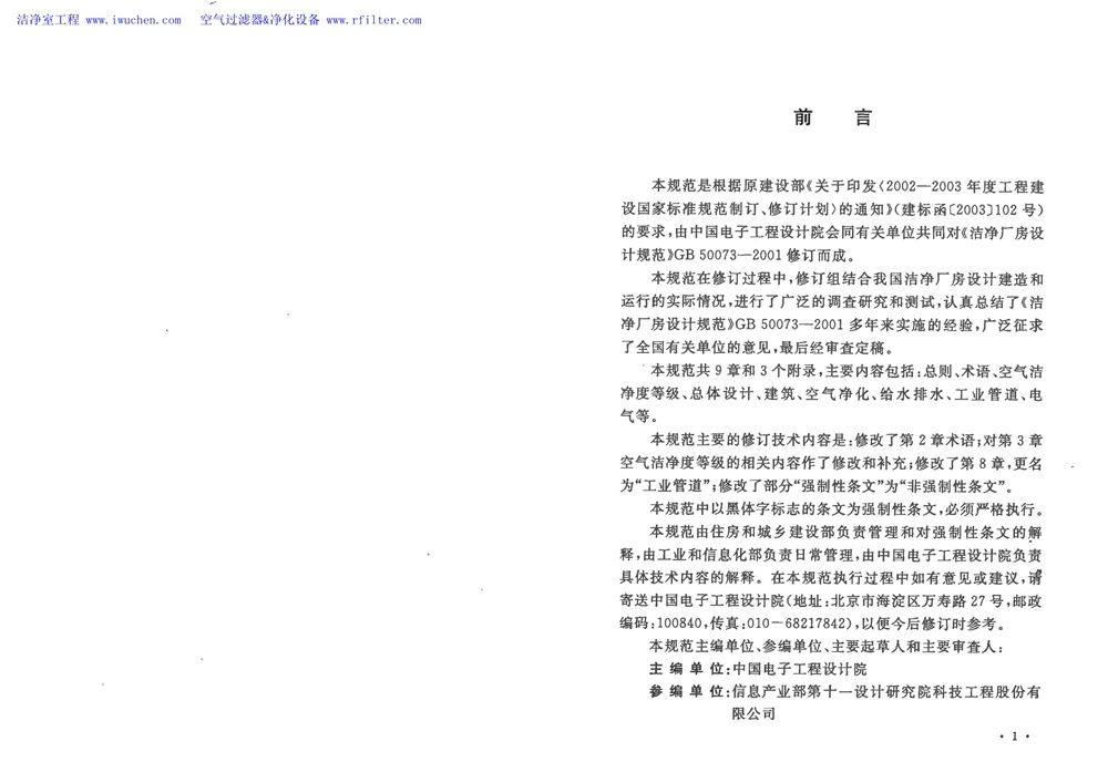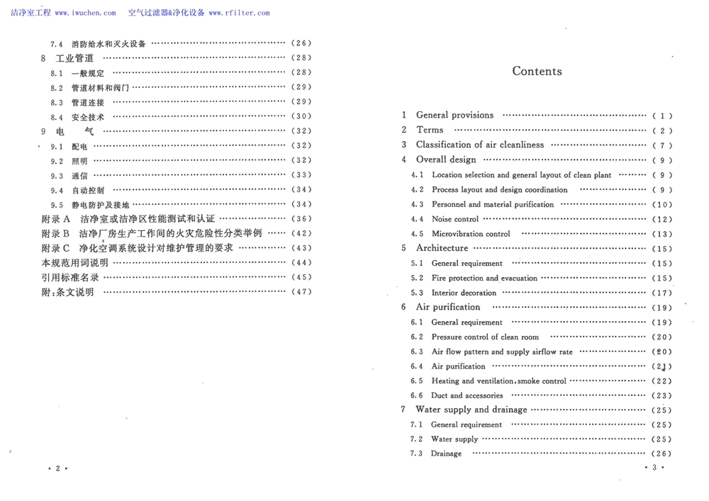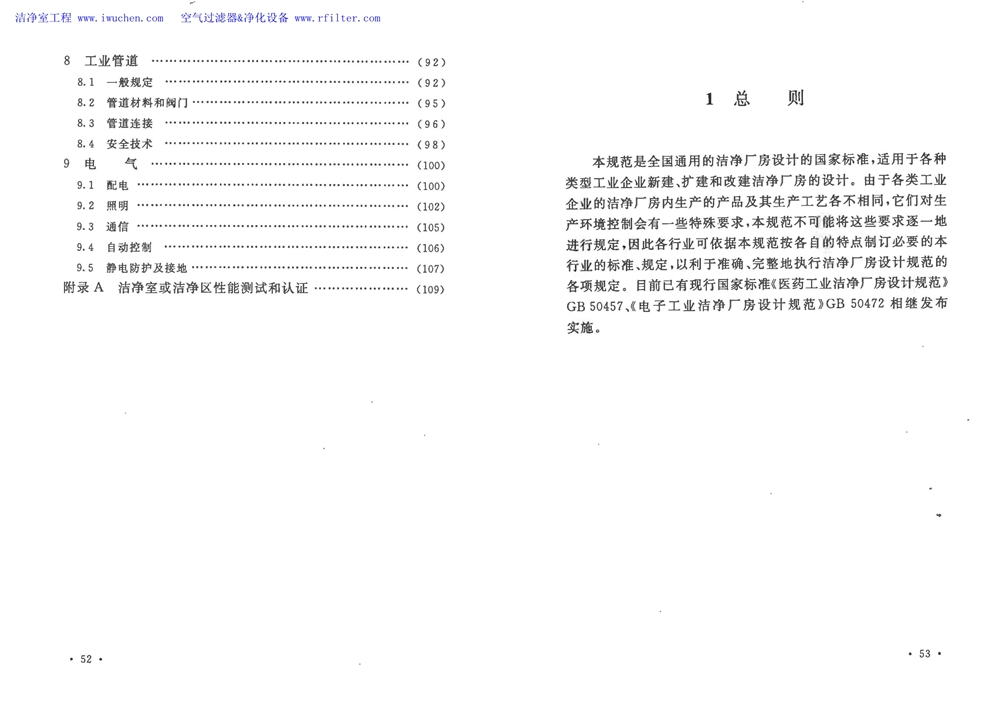 本规范共9章3个附录,主要内容包括:总则,术语,空气洁净度等级,总体设计,建筑,空气净化,给水排水,工业管道,电气。