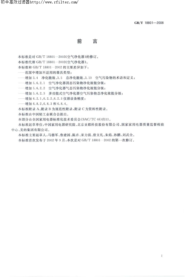 本标准代替GB/T18801-2002《空气净化器》。