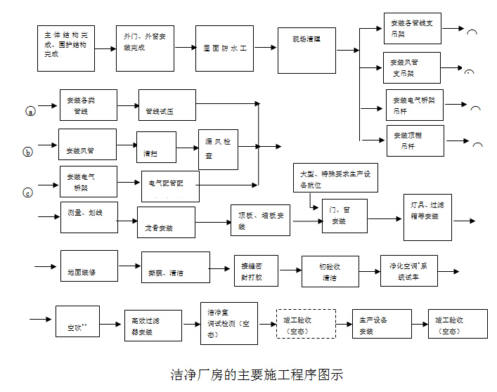 3)洁净厂房的施工安装需各专业、多工种密切配合,按具体工程实际情况,制定施工安装程序和计划进度,循环渐进地完成洁净厂房的施工建造。下图是洁净厂房的主要施工程序图示。