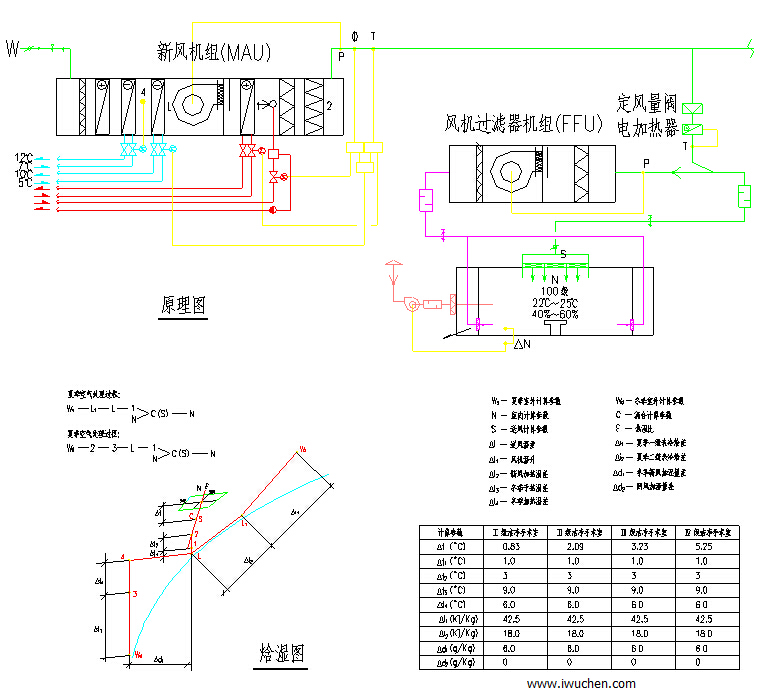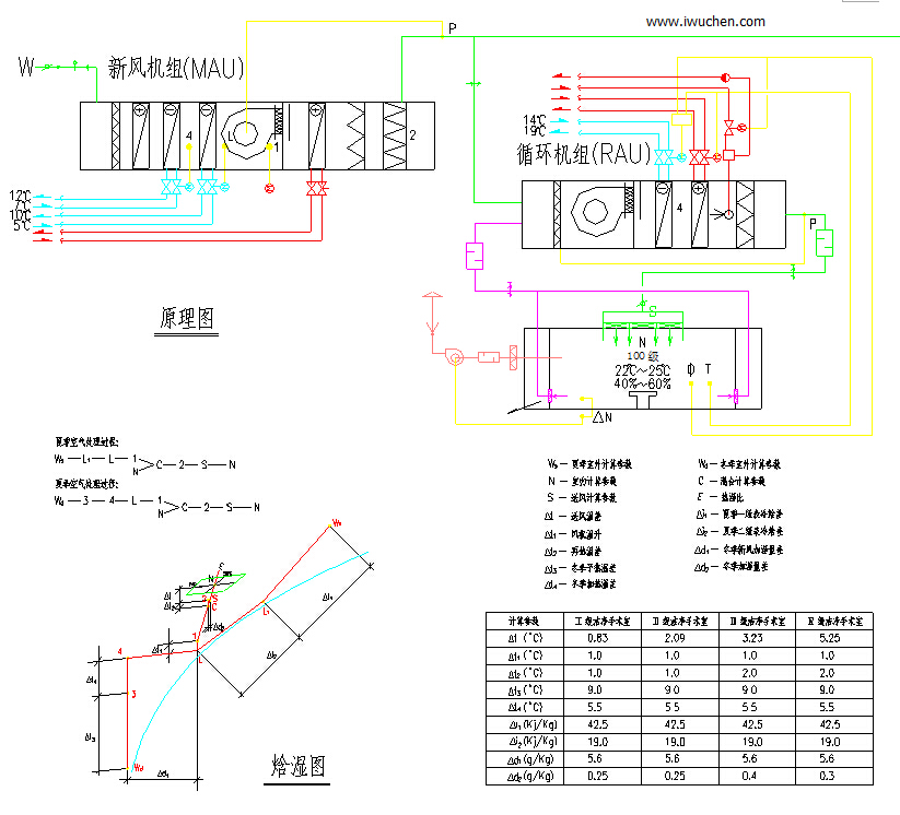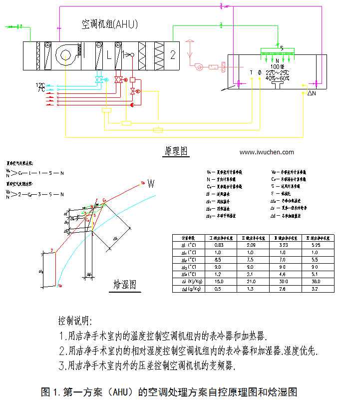 2、第二、第三方案的冷量、热量、加湿量基本相同,第四方案的能耗都小于第二,第三方案,但是在洁净手术室不工作的时间(大约占总时间的2/3)为了保证手术室的洁净度不受外界污染,就必须维持室内的一定正压,即必须向不工作的洁净手术室送一定量的经空调处理的洁净新风,此时第二方案不仅新风机组要运行而且循环机组内的风机也要开启,而第三方案和第四方案仅新风机组运行循环机组可停机节电,这就显出第三和第四方案的优点了。